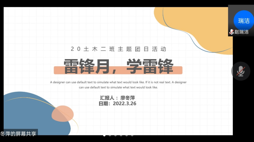 近日,2020级土木工程二班于线上开展了“回顾雷锋日”主题团日活动。会议由班级团支书廖冬萍主持,2020级土木工程二班全体人员参加。会议过程中廖冬萍通过播放视频回顾了以雷锋精神为主题的实践活动,介绍并宣传了“奉献他人,提升自己”的志愿服务理念。她号召同学们争做新时代雷锋精神的传播者、弘扬者和践行者,在之后的生活中,用实际行动践行“雷锋精神”,让“雷锋精神”永放光芒。