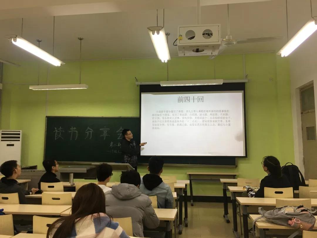 晚7点半,分享会正式开始,九名同学依次上台,结合图书的作者及内容展开介绍。其中,郑星阳从主要内容、思想内涵等方面向大家推荐了清代小说《镜花缘》,在讲解过程中,郑星阳与大家分享了自己对于书中部分章节的解读,并拓展介绍了书中提及的古典文化,提高了同学们的文学认知。随后,甘锐雪与同学们分享了书目《南京深处谁家院》,她首先介绍了本书的作者和自己眼中的南京,同时,通过朗读文章选段和幻灯片放映,带领同学们领略南京的独特魅力。此外,李昌鸿从作者简介、内容分析、名句分享和读后感悟四个方面介绍了路遥先生的《平凡的世界》一书,他提出,无论何时,世界总是由许许多多平凡的人所组成,而平凡的人也可以用不平凡的一生为每一个时代增添不平凡的色彩,鼓励大家要热爱生活,努力奋进。最后,班长钟杭航对本次读书分享会做了总结发言,会议圆满结束。